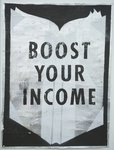 For this exhibition, The Reader, who is also known as Read More Books, Read Up, Mr. Bones, Rancor, and Open Your Eyes, has created a selection of graphic paintings. The black, white and red graphic design style and socio-political axioms are reminiscent of Barbara Kruger, with added grit. The skillful use of silkscreen, stencils, spray paint, collage, stickers, letterpress, stamps, and even shiny cigarette packages are materials sourced from and for the street, and transformed into works of art for the gallery.