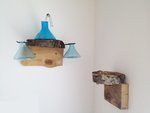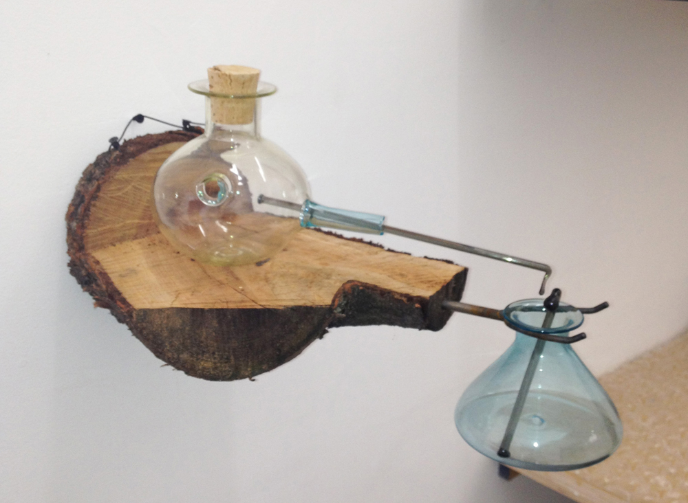 The methodology of “being clean and gritty at the same time” is also at play in Elias Hansen work. For this show, Hansen will exhibit a network of hand-blown glass beakers, plastic tubing, CFC light bulbs, welded steel, and freshly chopped wood. These components are brought together to simulate interconnectivity, dependency, and completion within a closed system. They take the form of a self-contained water fountain, metal tables, and wall shelves. The glass is hand-blown by Elias and the wood is locally sourced from the artist’s yard in Upstate New York.