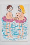 In the painting fuck you Fuck You FUCK YOU figures are shoved within the constraints of the canvas, all clawing at each other for a crimson object dangling above them from the hand of a lone, taunting figure. This single figure stands on top of a brown mound constructed from oil paint and newspaper clippings documenting recent flood images. The precarious mound has been built on destruction, much like greed and desire. Which begs the question, are we condemned to the same fate as the doomed figures in Bosch’s Garden of Earthly Delights?