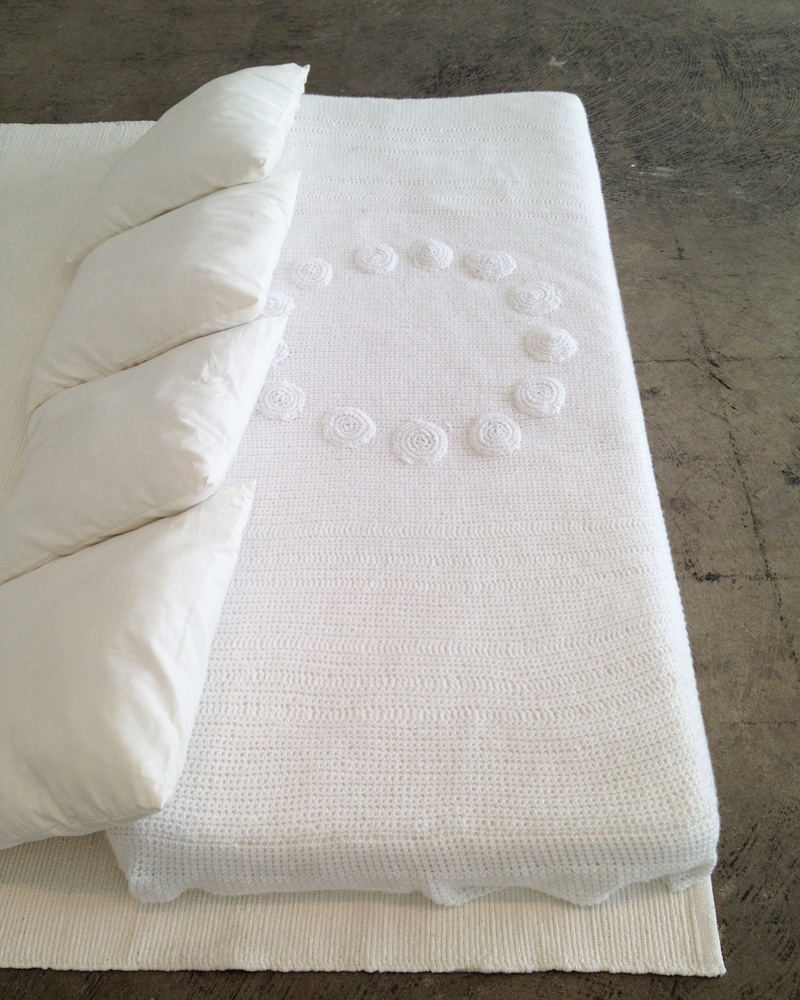 A series of ten all white abstract works on paper with painted canvas will be presented as energy works; collaged artifacts from Jen’s performance work relating to the color white as a medium, using circles and sacred geometry. While making the collages DeNike enters into a hypnotic state where physical labor merges into another state; something akin to what certain types of music can induce, like dance or meditation. In Kundalini yoga the practitioner raises energy from the lower chakras up the spine to the pituitary gland otherwise known as the third eye. Through the act of cutting and arranging the material, DeNike is raising energy and projecting it into the culmination of these visual abstractions.